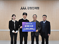 - 강원학사생’에서 ‘강원후원자’로최근 강원학사를 졸업한 윤재영 숙우(25세)가 후배 인재 육성을 위한 기부금 200만 원을 강원인재원(원장 김학철)에 기탁했다.기부자인 윤재영 숙…