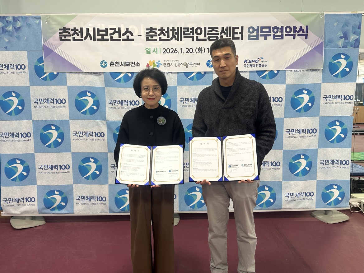 이번 협약은 양 기관이 상호 신뢰와 협력을 바탕으로 지역 주민에게 체계적인 건강 관리 서비스를 제공하고, 시민들의 체력 수준을 높이기 위해 마련됐으며, 권기성 국민체력100춘천체력인증센터장과 손은진 춘천시보건소장을 비롯해 양 기관 관계자들이 참석했다.
