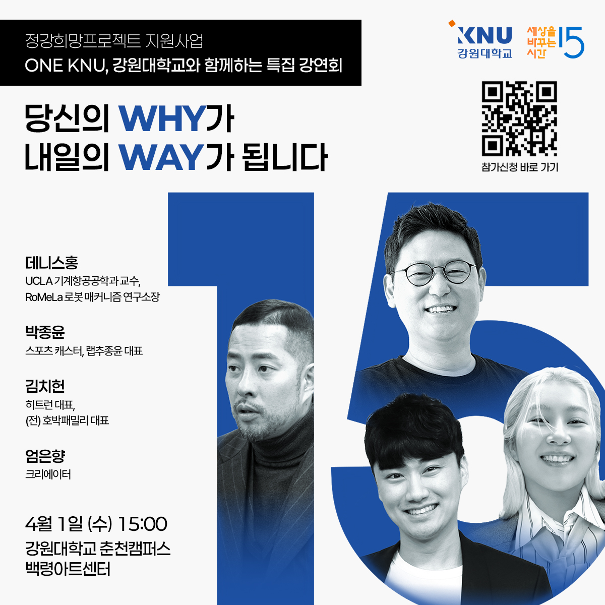 ‘당신의 WHY가 내일의 WAY가 됩니다’라는 주제로 열리는 이번 강연회는 지난 3월 공식 출범한 통합 강원대학교의 새로운 도약과 비전을 공유하고, 청년들이 각자의 성장 방향을 구체적으로 모색하고자 마련됐다.