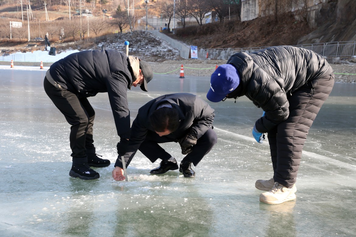 특히, 신영재 군수는 축제 핵심 공간인 결빙 구간을 직접 확인하며 빙질 상태와 얼음 두께를 장비로 측정하는 등 방문객 안전 확보를 위한 결빙 안전 기준 충족 여부를 점검했다.