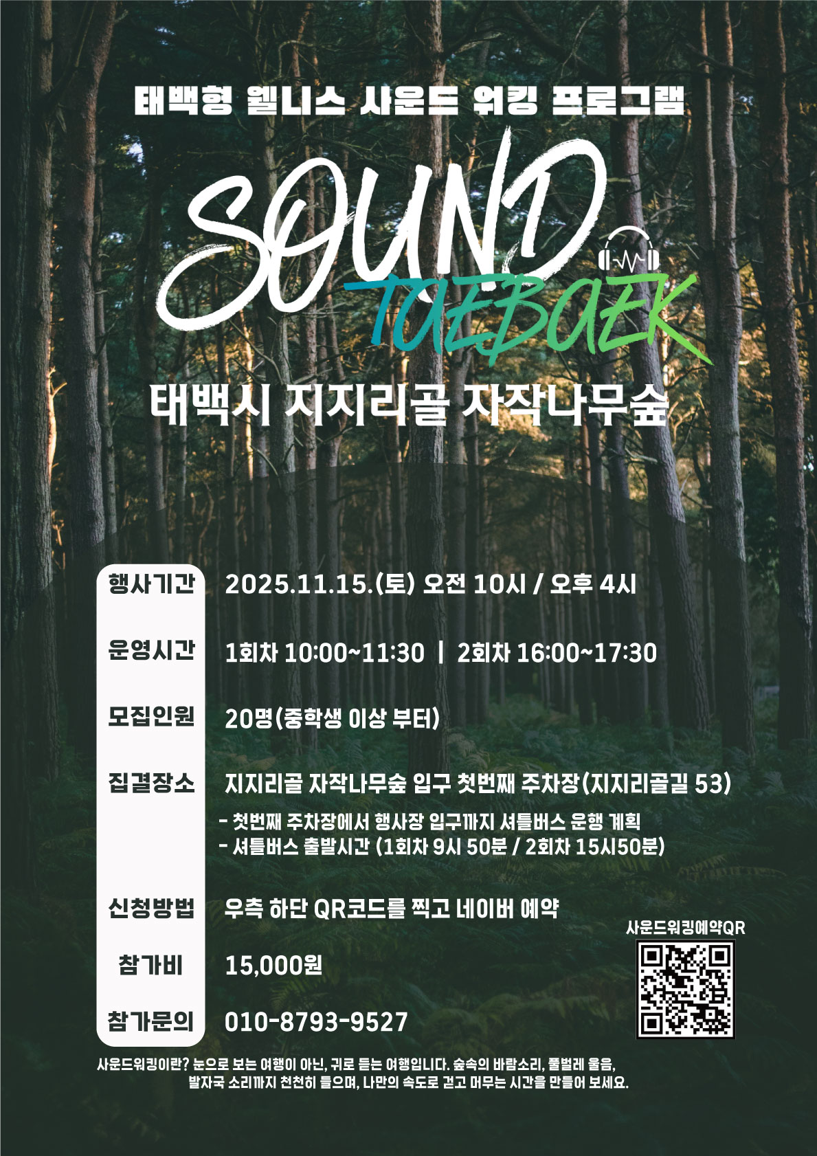 참여자들은 숲과 계곡을 걸으며 새소리·바람소리·물소리·발자국 소리 등 자연의 리듬을 온전히 느끼고, 태백의 역사와 생태, 마을 이야기가 담긴 사운드 콘텐츠를 통해 감각적 치유와 휴식을 경험하게 된다.