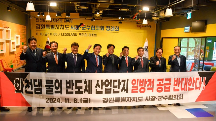 강원특별자치도 시장·군수협의회가 8일 춘천 레고랜드에서 열린 정례회에서 화천댐 물의 반도체 산업단지 공급 결정에 반대하는 결의문을 채택했다.