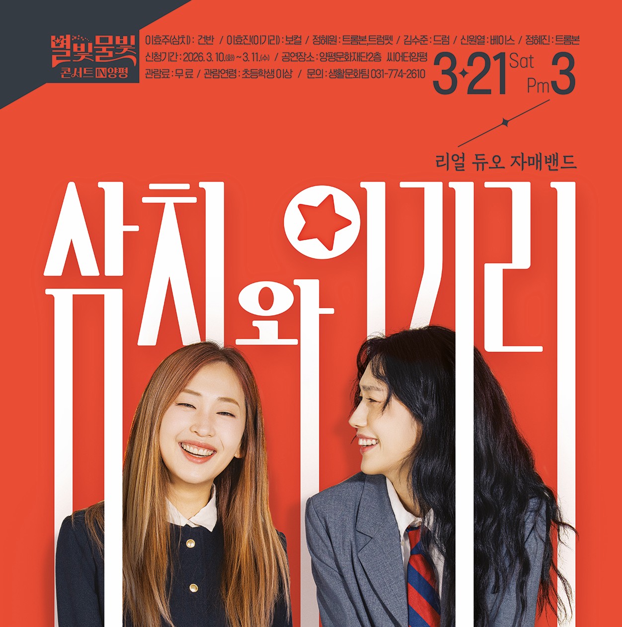양평문화재단이 오는 21일(토) 오후 3시, 양평문화재단 2층 씨어터양평에서 ‘별빛물빛 콘서트 in 양평’ 3월 정기공연으로 포크 밴드 <삼치와 이기리>의 공연을 선보인다.