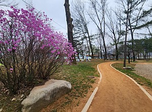 △ 화천 붕어섬 맨발길 옆으로 활짝 핀 진달래△ 춘천맨발학교 회원들이 붕어섬 맨발황톳길에서 슬로우 조깅을 하고 있다춘천맨발학교가 4일 화천붕어섬 맨발황톳길에서 진행한 맨발걷기 행사…