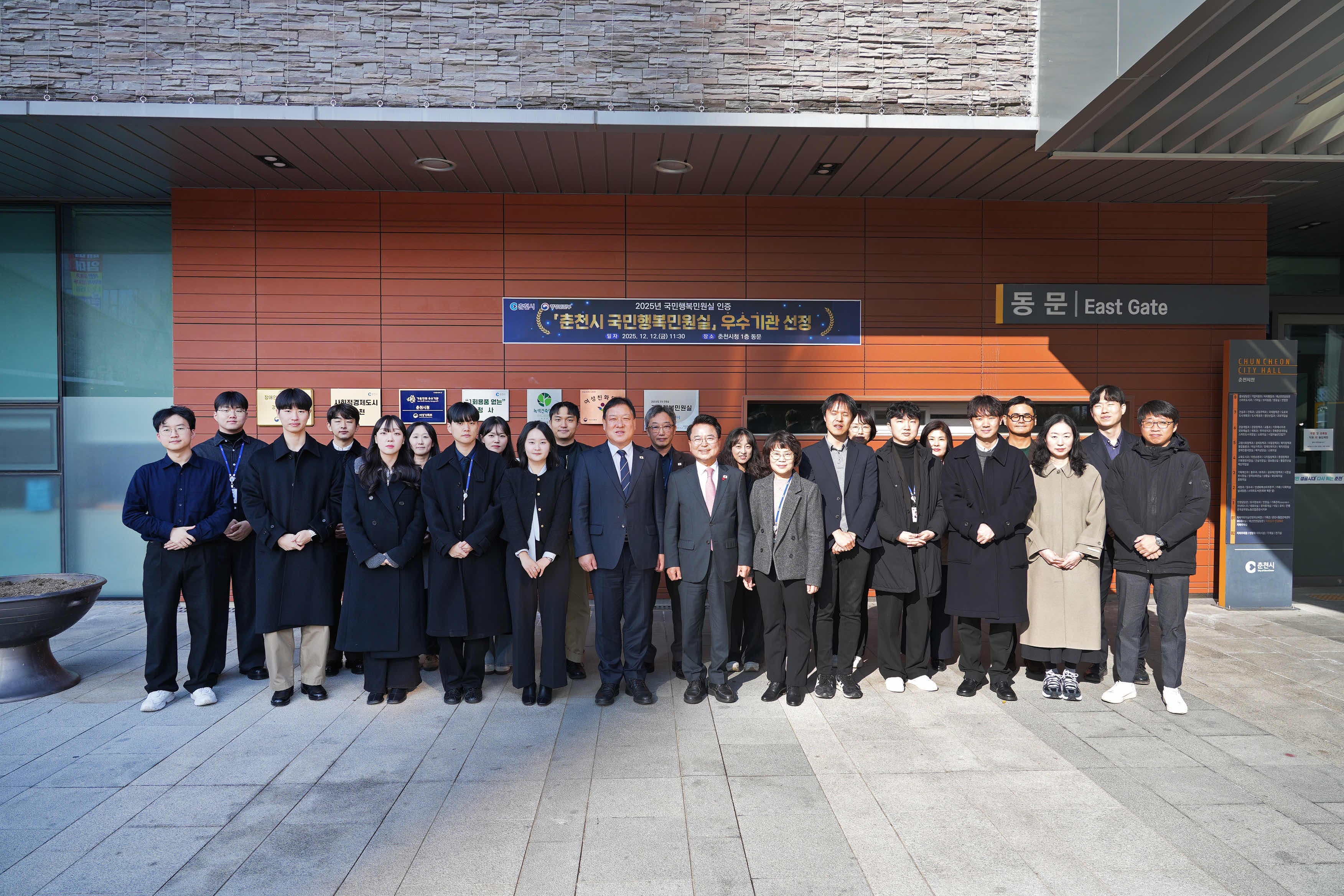 춘천시가 12일 시청 1층 동문에서 ‘국민행복민원실’ 인증 현판식을 열었다. 이번 현판식은 행정안전부 국민행복민원실 신규 인증과 전국 우수기관 선정 성과를 시민과 공유하고 춘천시 민원서비스의 우수성을 알리기 위해 마련됐다.
