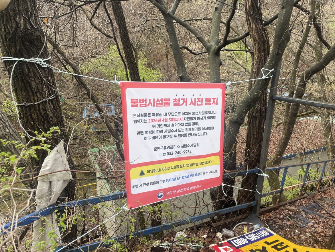 산림청 춘천국유림관리소가 국유림 내 하천·계곡에서 무단으로 설치된 평상, 그늘막, 가설건축물 등 불법점용시설물을 전수조사하고, 이달부터 본격적인 정비에 착수한다고 밝혔다.