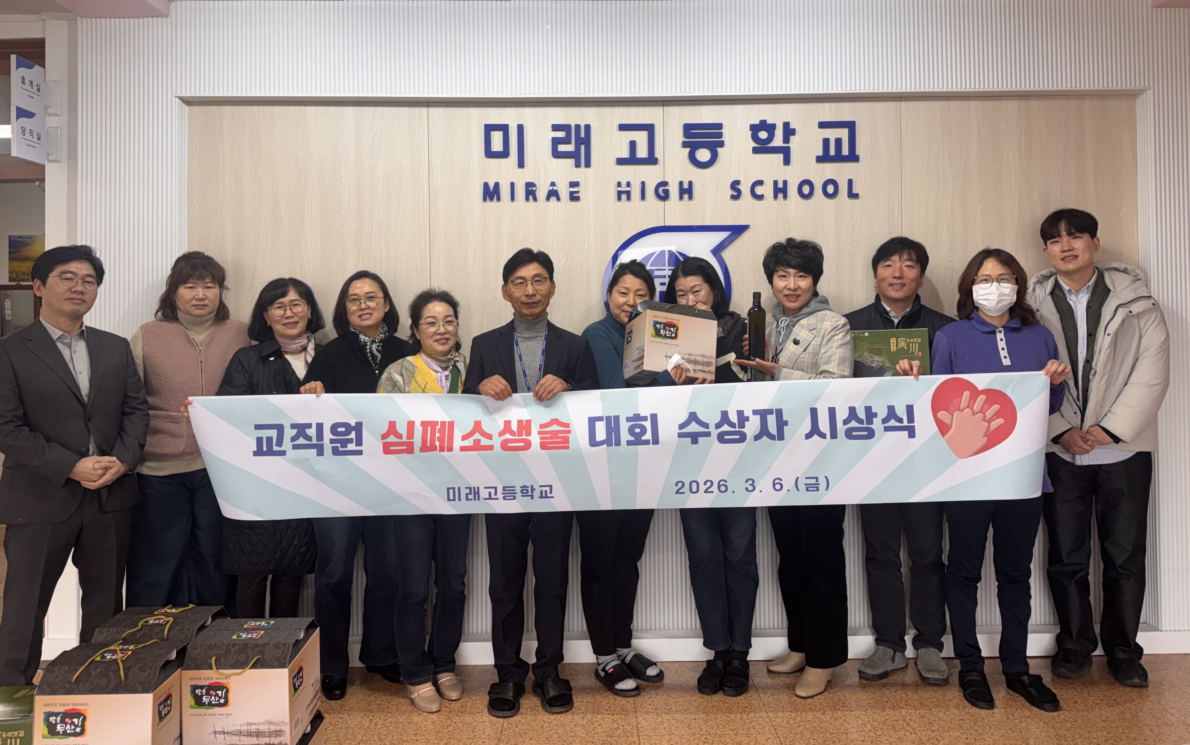 원주 미래고등학교가 3월 6일(금) 오전 10시 본관 1층 중앙현관에서 교직원의 산업재해 예방과 생명권 보호를 위해 겨울방학 기간 중 실시한 교직원 ‘심폐소생술(CPR) 대회’ 시상식을 개최했다.